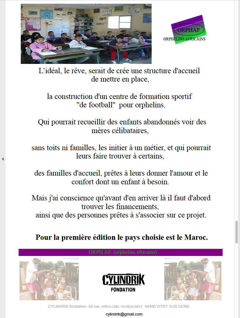 LE RÊVESerait de crée une structure d'accueil en faveur des orphelins, de mettre en place la construction d'un centre de formation sportif ''de football'' réserver aux orphelins. Qui pourrait recueillir des enfants abandonnés, voir des mères célibataires, sans toits ni familles, les initier à un métier, et qui sait pourrais faire trouver à certains, des familles d'accueil, prêtes à leurs donner l'amour et le confort dont un enfant à besoin.
