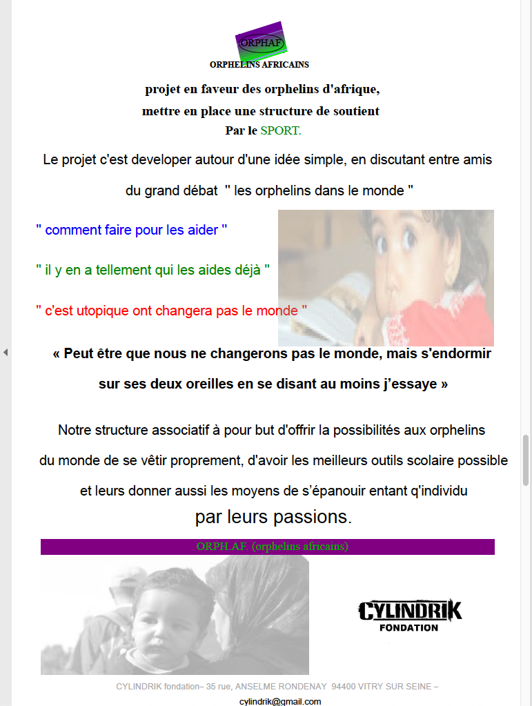 Notre structure associatif à pour but d'offrir la possibilités aux orphelins du monde de se vêtir proprement, d'avoir les meilleurs outils scolaire possible et leurs donner aussi les moyens de s’épanouir entant q'individu par le sport et toutes autres passions...